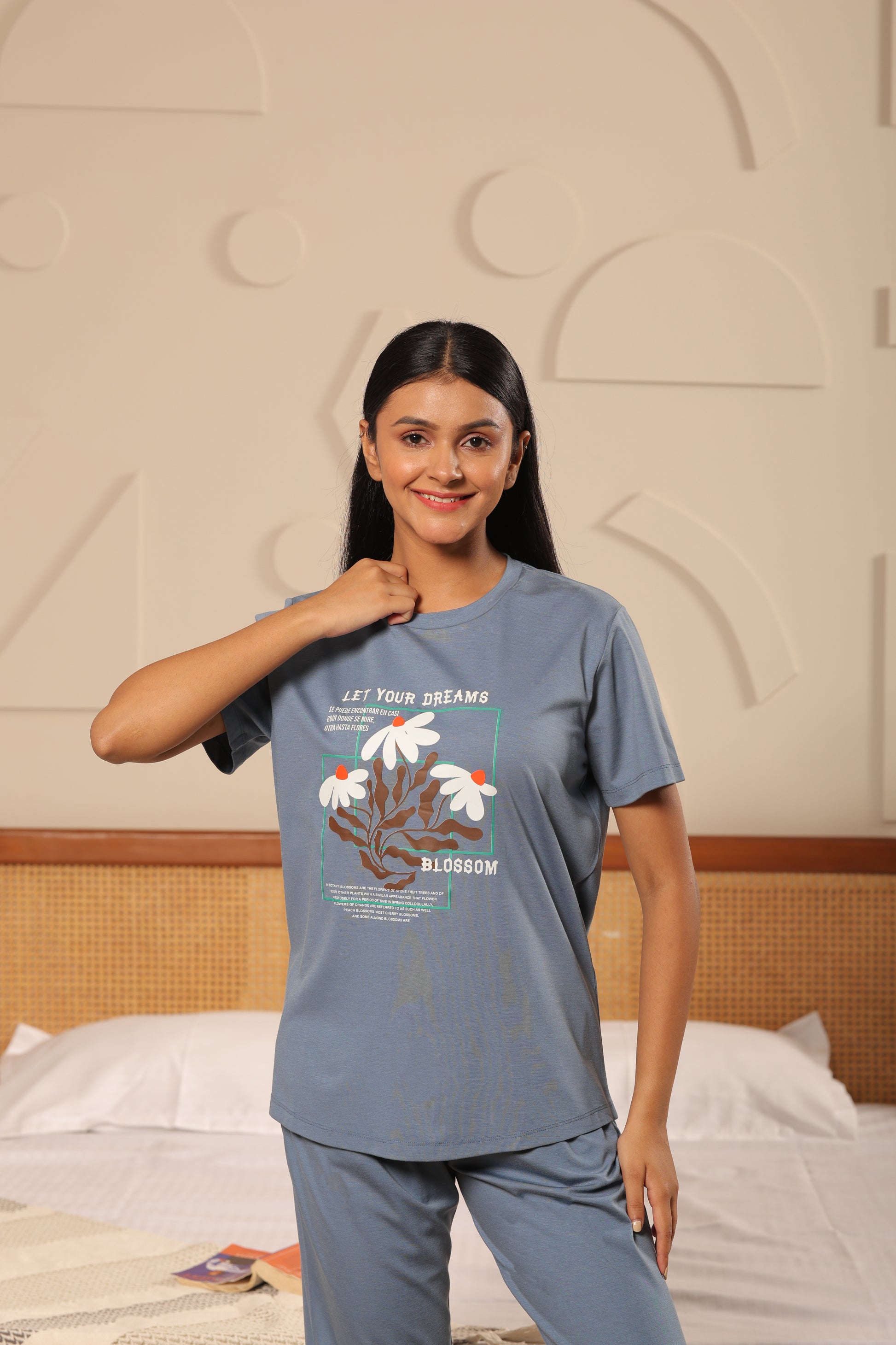 Unwind in pure comfort and modern sophistication with this Tencel Blend Night Suit, expertly crafted from a luxurious mix of 95% imported Tencel and 5% Lycra. Designed for those who prioritize softness, breathability, and fluid movement, this set features a stretch-infused top and silky, drapey bottoms that feel like second skin. The eco-friendly fabric enhances your lounging experience while offering a sleek silhouette and elevated design details — perfect for every season and any slow moment.