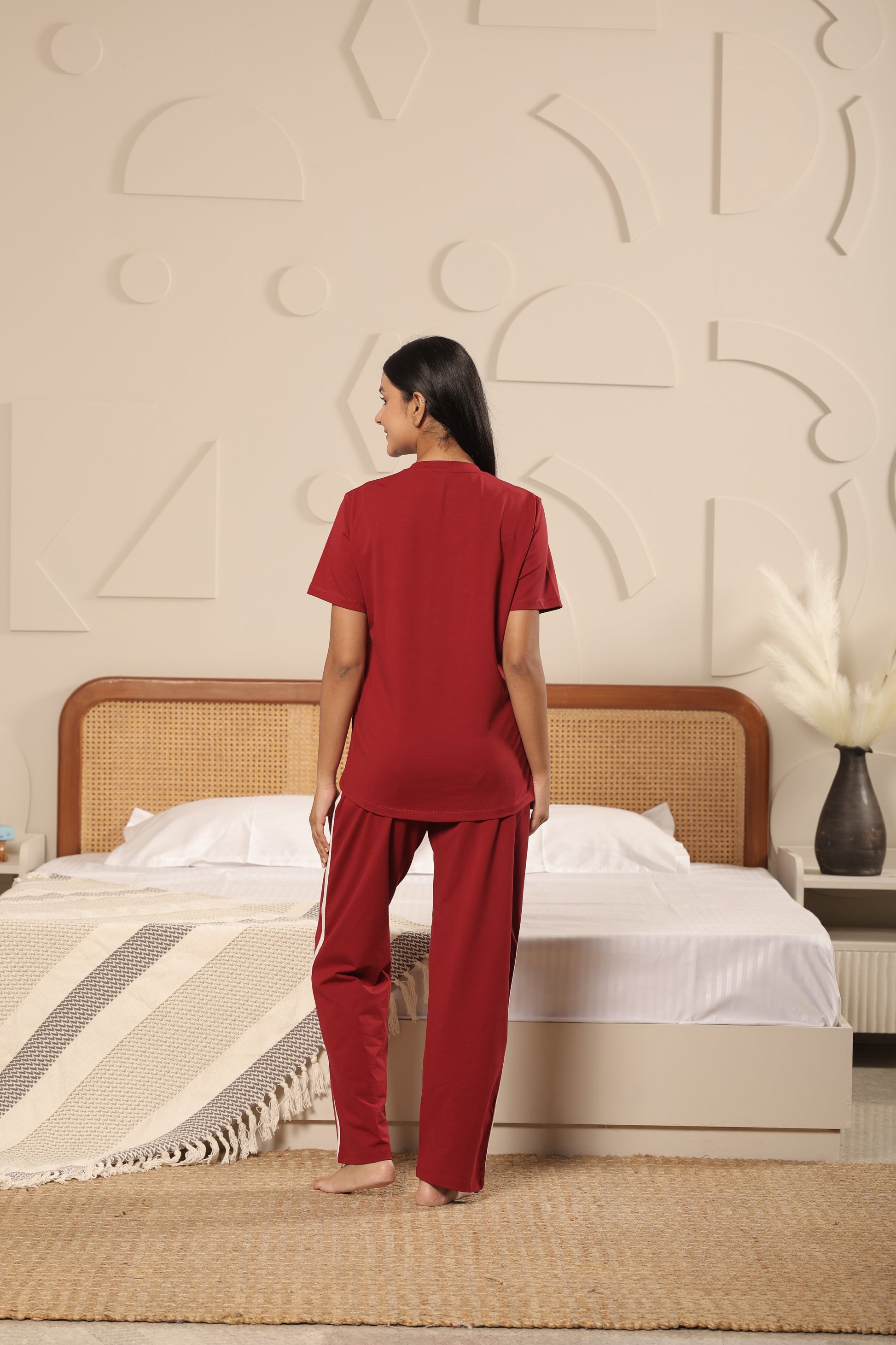 Unleash your bold side in the CottonBloom Crimson Ease Set, a vibrant and sporty co-ord designed to elevate your off-duty wardrobe. With a deep maroon base and contrast white stripe accents, this two-piece cotton-lycra blend set is equal parts relaxed and stylish. Whether you're lounging at home or stepping out for a casual stroll, it keeps you comfy, confident, and effortlessly cool.