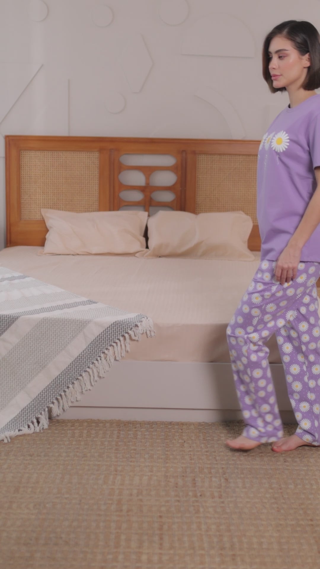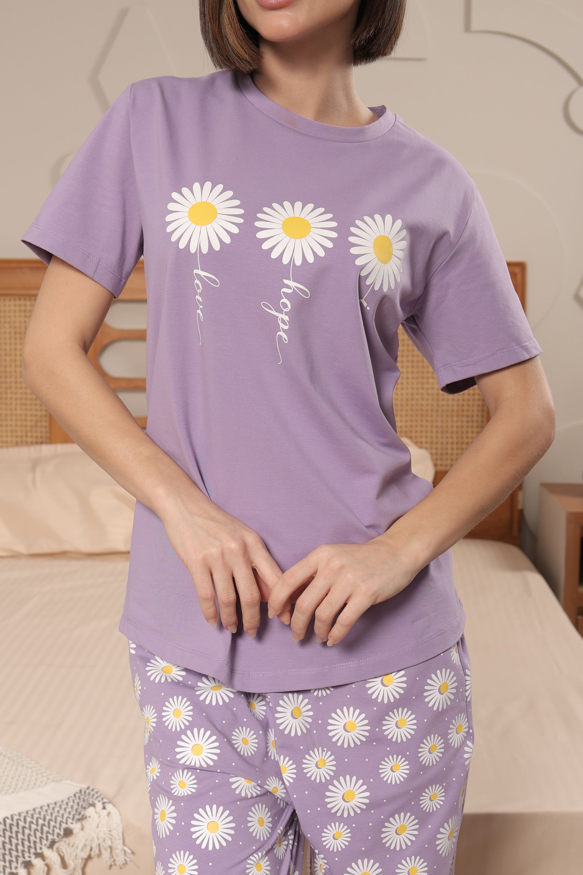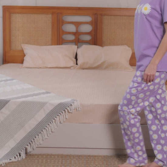 Step into serenity with the CottonBloom Daisy Dreams Set, a cheerful two-piece loungewear set crafted to keep you smiling from sunrise to sleep. Featuring a soft lavender tee with charming daisy graphics and perfectly paired floral print pants, this set is the definition of easygoing elegance. Whether you're reading on the couch or unwinding after a long day, the breathable cotton-LYCRA® blend ensures flexible comfort and feel-good vibes.
