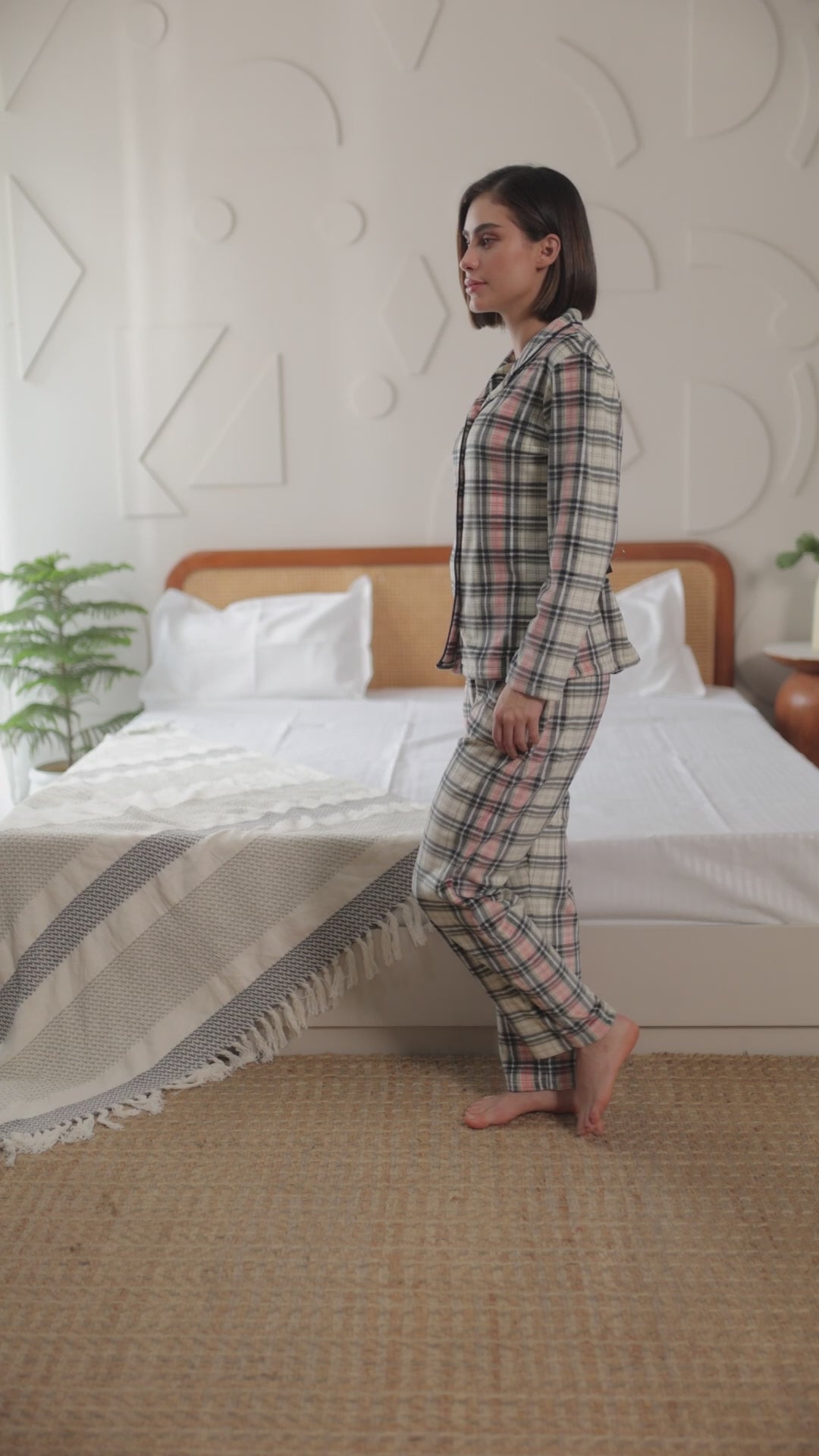 Upgrade your nightwear wardrobe with the Kiza Women’s Button-Down Checked Night Suit. Styled in a classic plaid pattern with shades of cream, blush pink, and charcoal, this set brings timeless charm to bedtime and beyond. Featuring a collared full-sleeve shirt with front buttons and coordinated straight-fit pajama bottoms, it combines cozy comfort with effortless style. Ideal for lounging at home, cozy evenings, or restful nights of sleep.