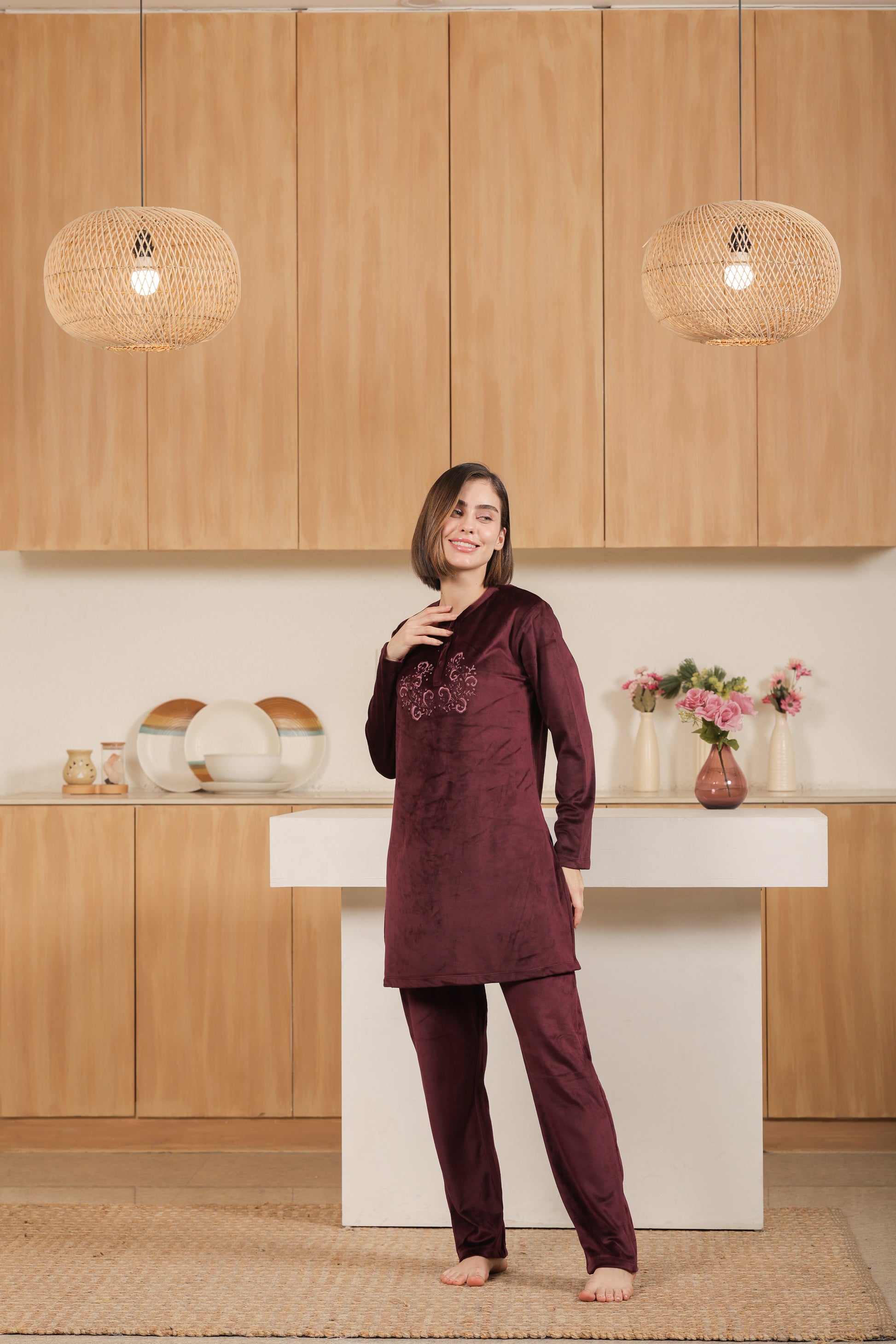 Add a touch of grace to your nightwear with the Kiza Women’s Embroidered Kurta-Style Night Suit in a deep maroon shade. Designed with a straight-cut kurta featuring delicate embroidery across the chest, this set brings together elegance and comfort. The soft velour fabric feels luxurious on the skin, offering breathability and warmth, making it perfect for cozy evenings, relaxed weekends, or restful sleep.