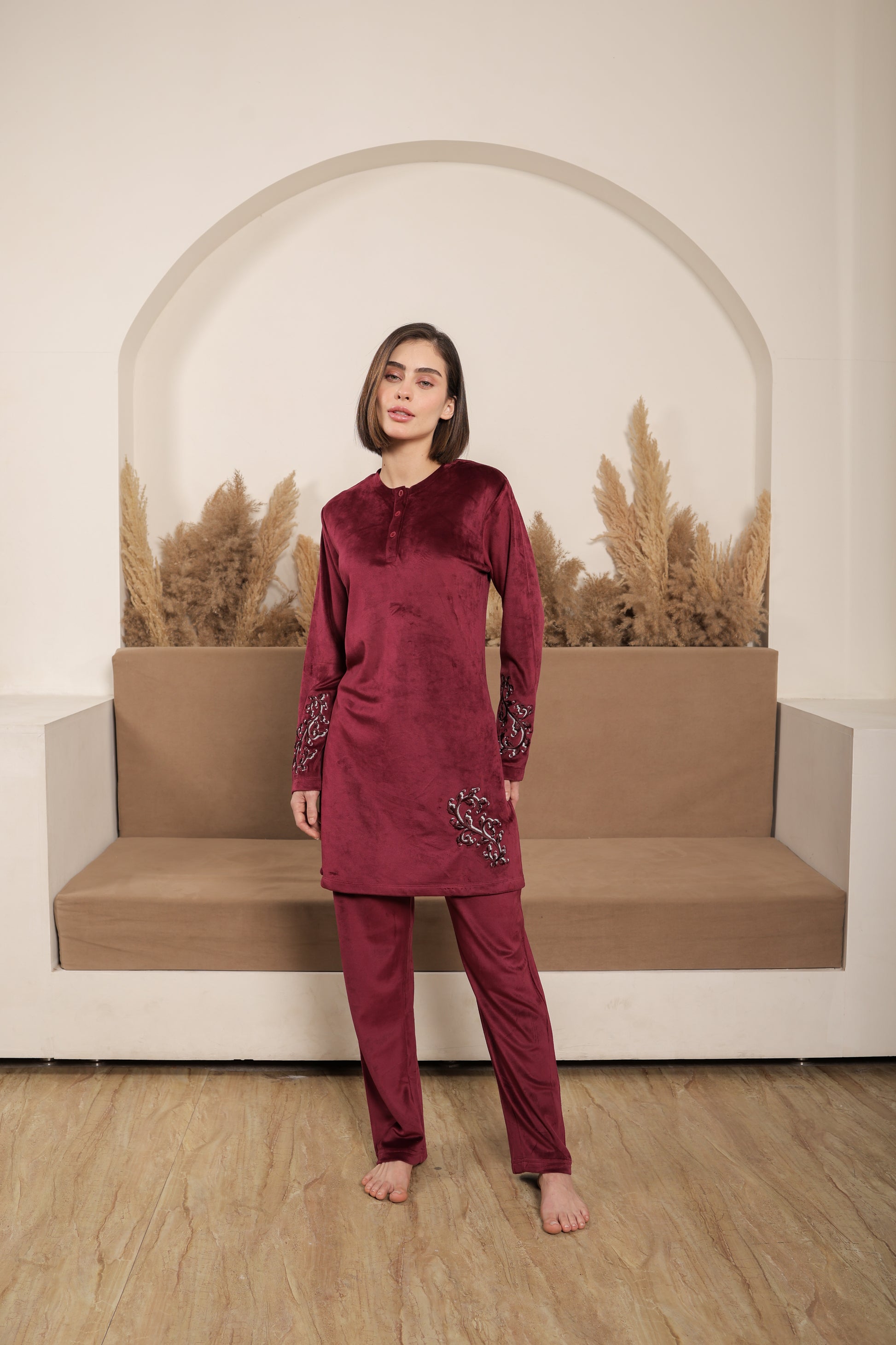 Elevate your nightwear with the Kiza Women’s Embroidered Kurta-Style Night Suit in a deep maroon shade. Featuring a buttoned Henley neckline and tasteful embroidery on the lower side, this set blends timeless elegance with everyday comfort. Crafted from luxuriously soft velour, the fabric provides warmth, breathability, and an effortlessly chic look, making it perfect for unwinding at home or enjoying a cozy night’s rest.