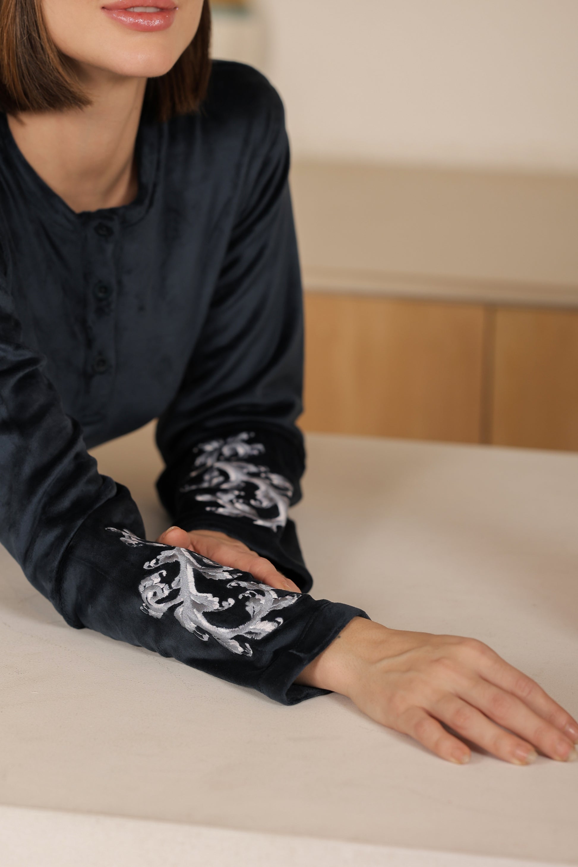 Stay cozy in elegance with the Kiza Women’s Embroidered Kurta-Style Night Suit in classic navy blue. This premium set features a kurta-style top with intricate embroidery on the sleeves and hemline, offering a sophisticated twist to your nightwear. Paired with straight-fit pajama bottoms, it combines functionality with a luxurious aesthetic. The velour fabric ensures a plush feel while keeping you warm and comfortable—perfect for evenings at home, weekend lounging, or restful sleep.