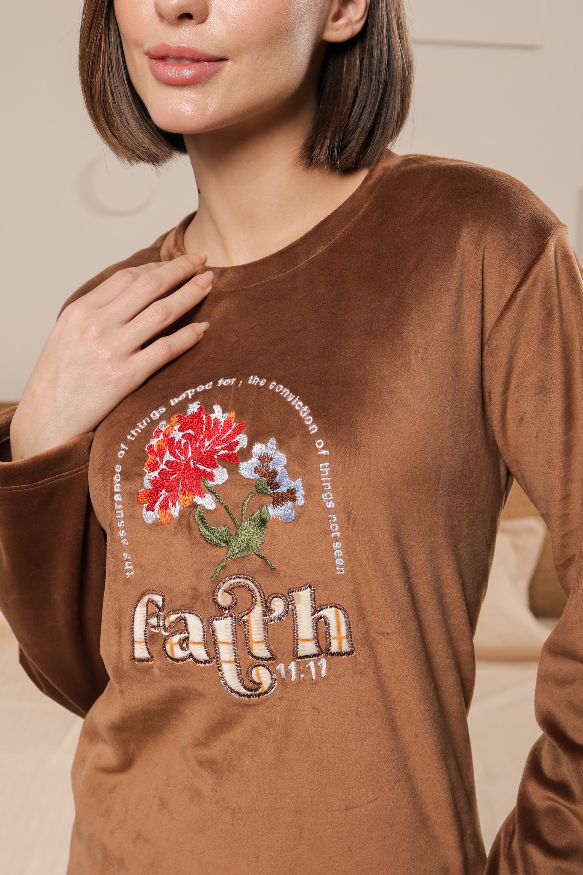 Indulge in the cozy sophistication of the Kiza Women’s Faith Printed Night Suit — where style meets comfort in the softest velour. The warm caramel-brown top, accented with an inspirational floral “Faith” print, exudes a blend of comfort and charm. Paired with soft beige check pajama pants, this set is designed for those who appreciate elegance even in their downtime. Perfect for cozy nights, lazy mornings, or relaxed evenings at home.