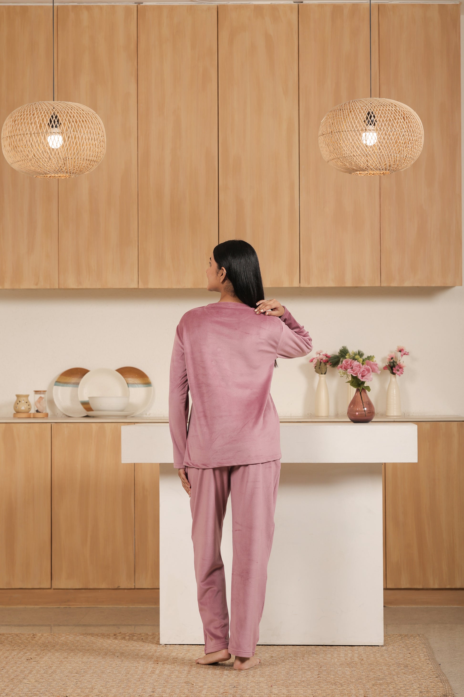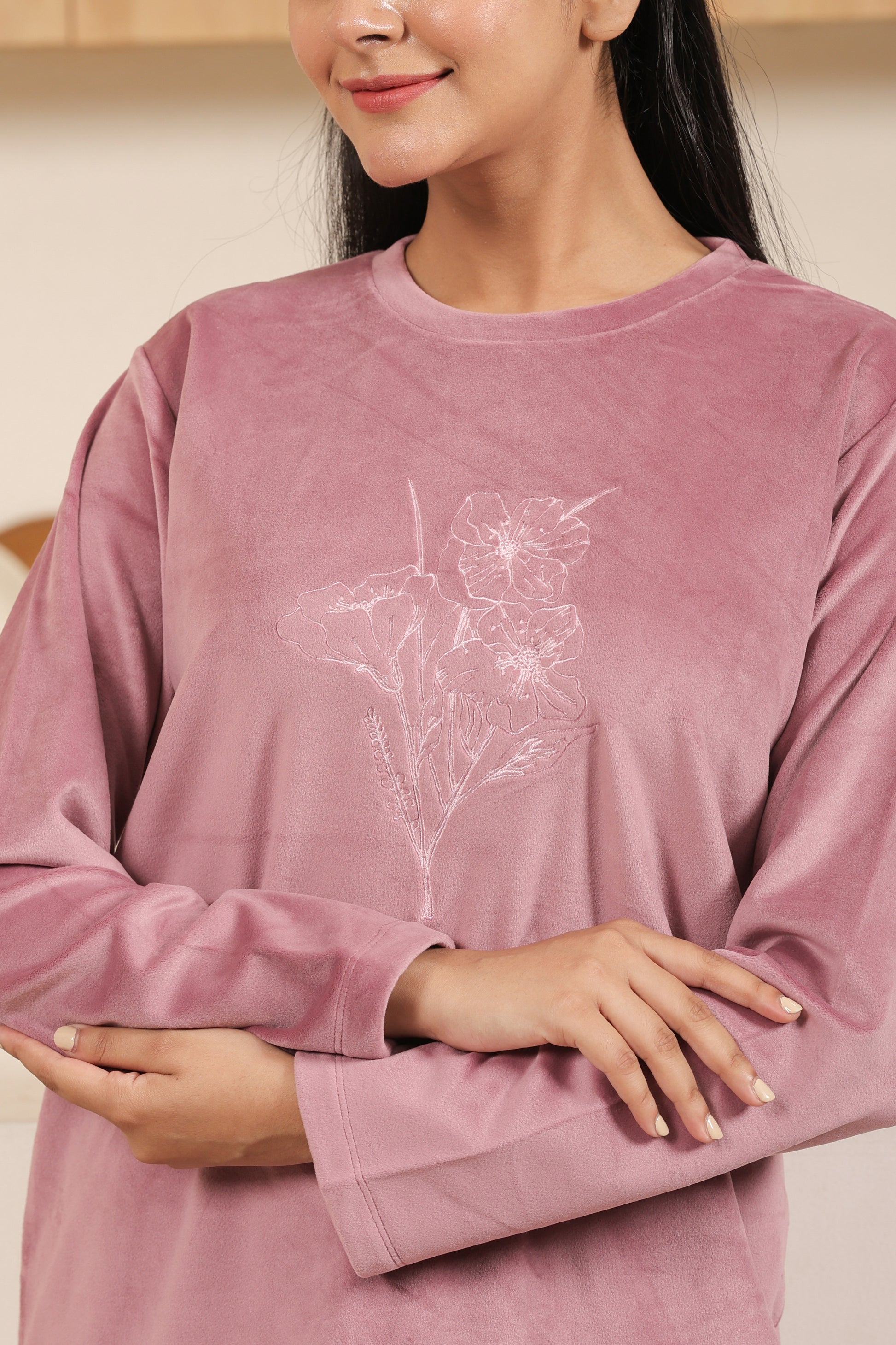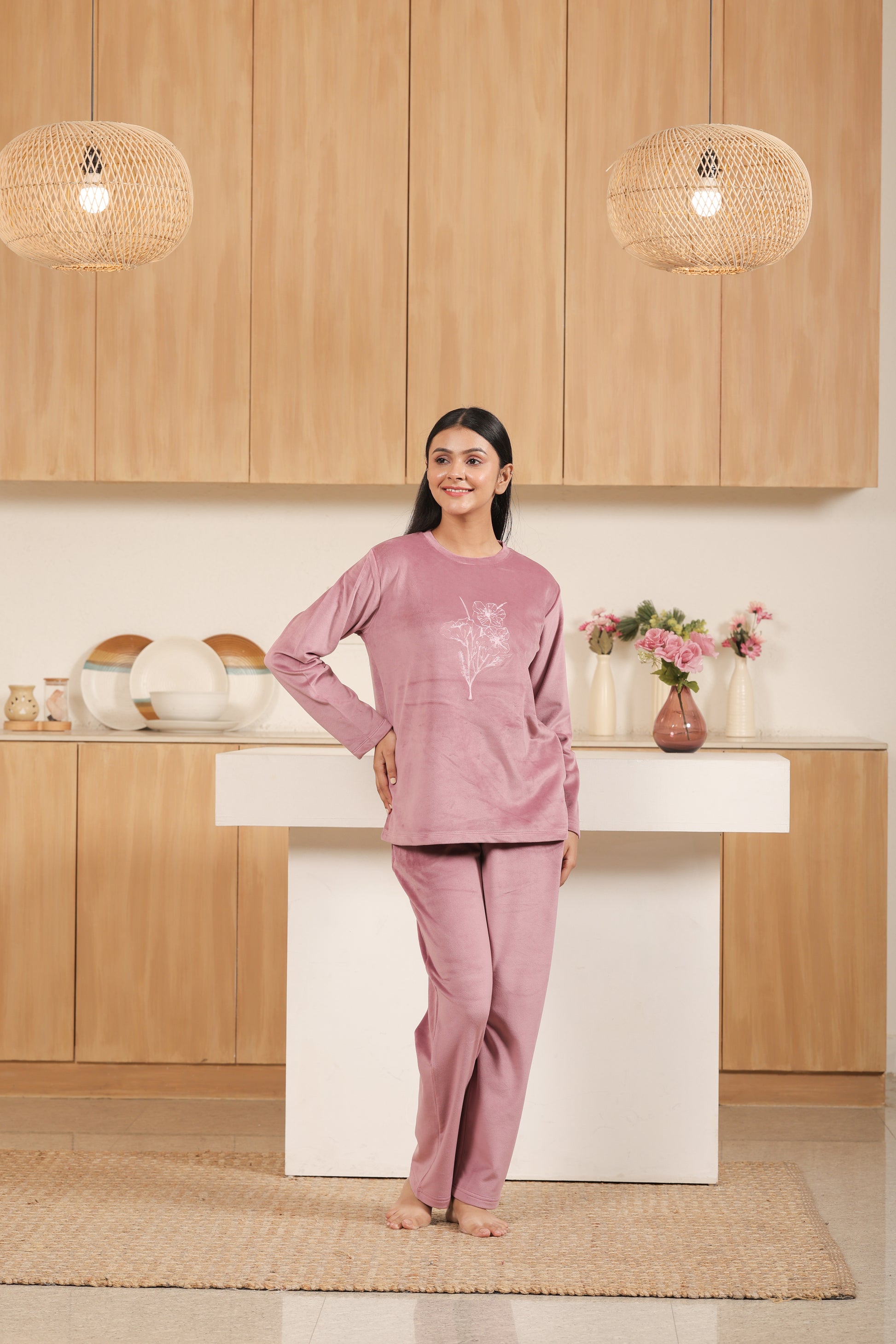 Elevate your downtime with the Kiza Women’s Round Neck Embroidered Night Suit. Styled in a soft blush mauve shade, this two-piece set combines elegance and comfort. The top features a subtle floral embroidery detail at the front, adding a touch of sophistication to your nightwear. Crafted from premium velour fabric, it offers breathable warmth, a plush hand feel, and effortless coziness—perfect for restful nights or laid-back days at home.