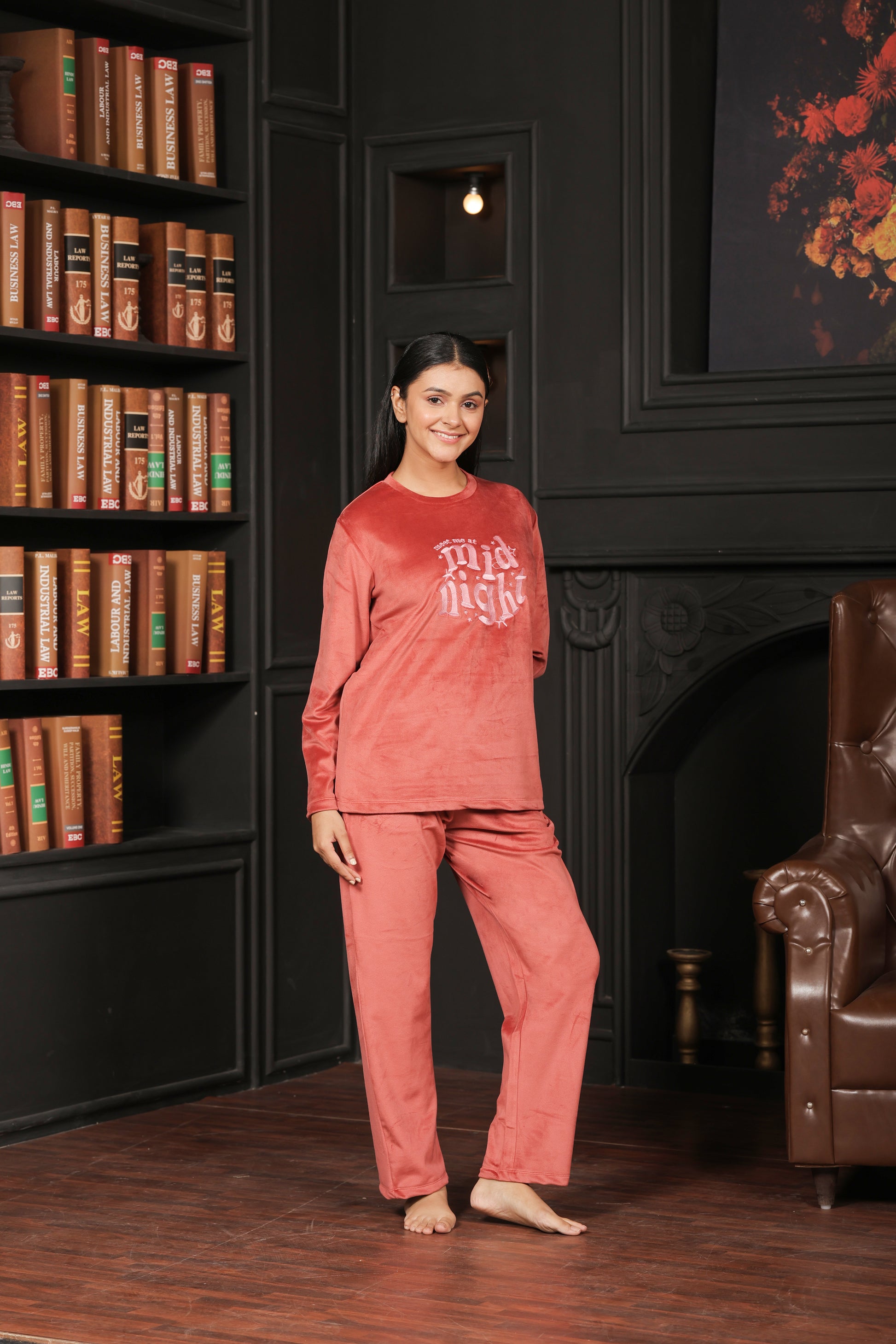 Step into ultimate comfort with the Kiza Women’s Round Neck Printed Night Suit. Designed in a rich rust shade with a playful front print, this set adds charm to your nightwear collection. Made from luxuriously soft and breathable velour fabric, it ensures warmth, comfort, and effortless style. Perfect for lounging at home, enjoying cozy evenings, or drifting into a peaceful night’s sleep.