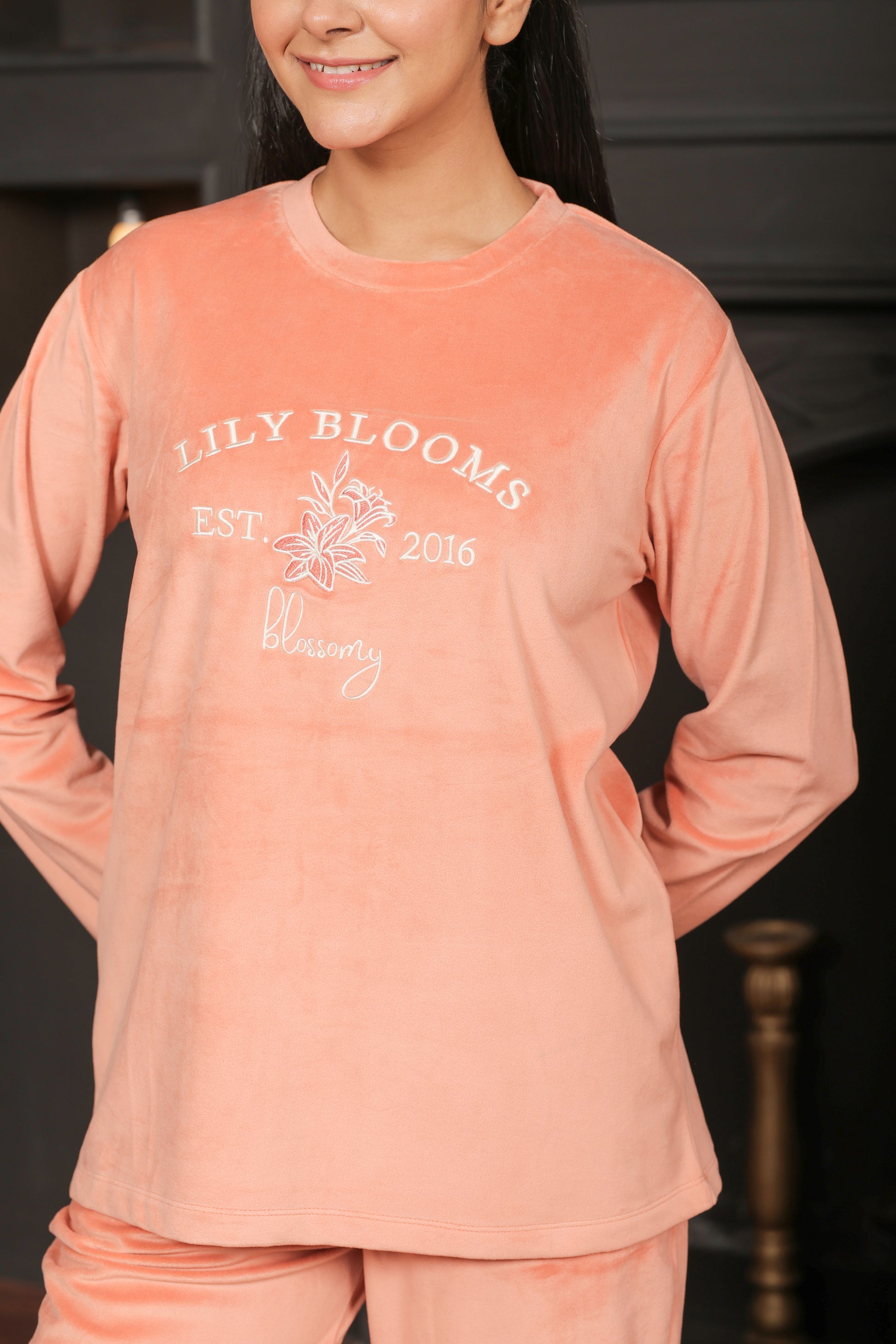 Add a refreshing touch to your nightwear collection with the Kiza Women’s Round Neck Printed Night Suit in a soft peach hue. Accented with a chic front print that reads “Lily Blooms – Est. 2016”, this cozy set blends playful design with ultimate comfort. Made from plush, breathable velour fabric, it ensures warmth, softness, and all-day relaxation. Perfect for peaceful nights, lazy mornings, or lounging in style at home.